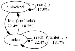 which specifies that a transition from the unlocked state to the locked state can be made by calling the lock function, or we can call the read function and remain in the same state. eqc_fsm generates test cases which follow the transitions specified in this way from state to state. The argument generators for the lock and read function are generated with an _args callback in the same way as eqc_statem provides argument generation.
