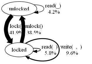 might represent a locker containing N values. When attributes are used, then the state names are tuples of the function name and the attribute values. States with different attribute values are considered to be different states: {unlocked,0} and {unlocked,1} are different states in this example. Since QuickCheck enumerates every reachable state, then it is important that there are only finitely many reachable attribute values--this is why we only include an add transition when N is less than 4 in the example above--this ensures that states {unlocked,N} are not reachable for N greater than or equal to 5.